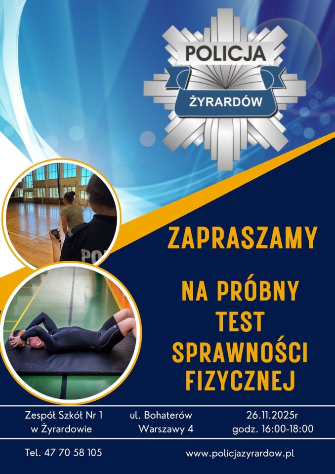 Komenda Powiatowa Policji w Żyrardowie zaprasza 26 listopada w godz. 16:00-18:00 do hali sportowej przy Zespole Szkół nr 1, ul. Bohaterów Warszawy 4 w Żyrardowie na próbny test sprawności fizycznej. To okazja, by poznać wymagania i porozmawiać z funkcjonariuszami o służbie i etapach kwalifikacyjnych.