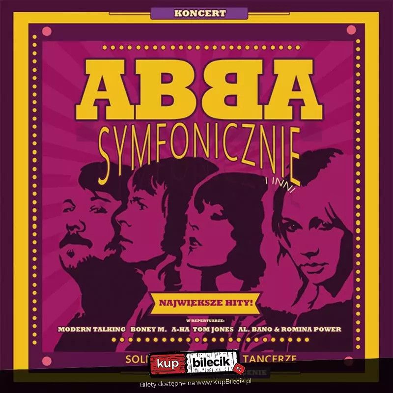 bilety: Koncert Pełen Hitów! Wspomnienie Złotej Ery Muzyki Rozrywkowej. ABBA I INNI Symfonicznie II artyści: Różni artyściNiewiele zespołów może się pochwalić faktem, że stało się symbolem muzycznym całej dekady, było głównym towarem eksportowym swojego kraju oraz że na podstawie jego muzyki napisano musical, który potem doczekał się ekranizacji. A to wszystko stało się udziałem czwórki skandynawskich wykonawców: nie wyobrażamy sobie lat "70 bez "Waterloo", "Honey, Honey", "Money, Money, "Money", tak jak nie wyobrażamy sobie Szwecji bez ABBY, zaś film "Mamma mia!" był wydarzeniem w roku 2008. Wszyscy, którzy bawili się przy muzyce zespołu Boney-M czy Modern Talking, również odnajdą się znakomicie w atmosferze naszego koncertu: obiecujemy uśmiech i wzruszenie, powrót wspomnień i świetną zabawę dzisiaj, bo przecież "szczęściem jest pozostać bliskimi sobie jak dzieci", jak głosi piosenka "Felicità" - największy przebój duetu Al Bano i Romina Power, którego muzyka także zabrzmi podczas tego niezwykłego wieczoru... Bilety do nabycia na: KupBilecik.pl |